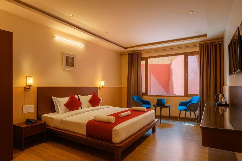 Wake up to enchanting views of Nainital’s serene hills in our Super Deluxe Room, where comfort meets breathtaking beauty. Thoughtfully designed with warm interiors and large windows, it’s perfect for relaxing with a cup of tea or simply unwinding in bed as you watch the mist drift across the valley. Enjoy a king-size bed, free Wi-Fi, smart TV, tea/coffee maker, geyser, and intercom for a cozy, effortless stay.