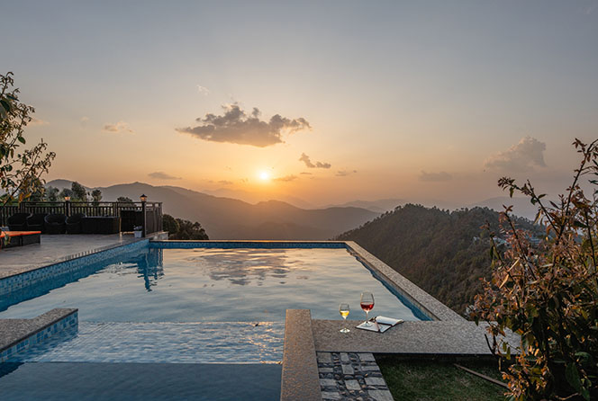 Dive into serenity at Ojaswi Himalayan Resort’s infinity pool, where panoramic Himalayan views meet ultimate relaxation.
